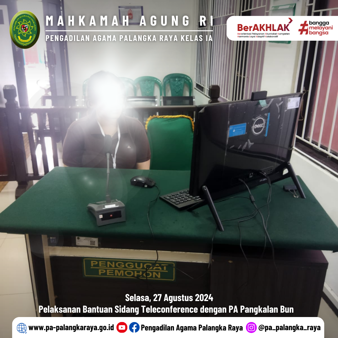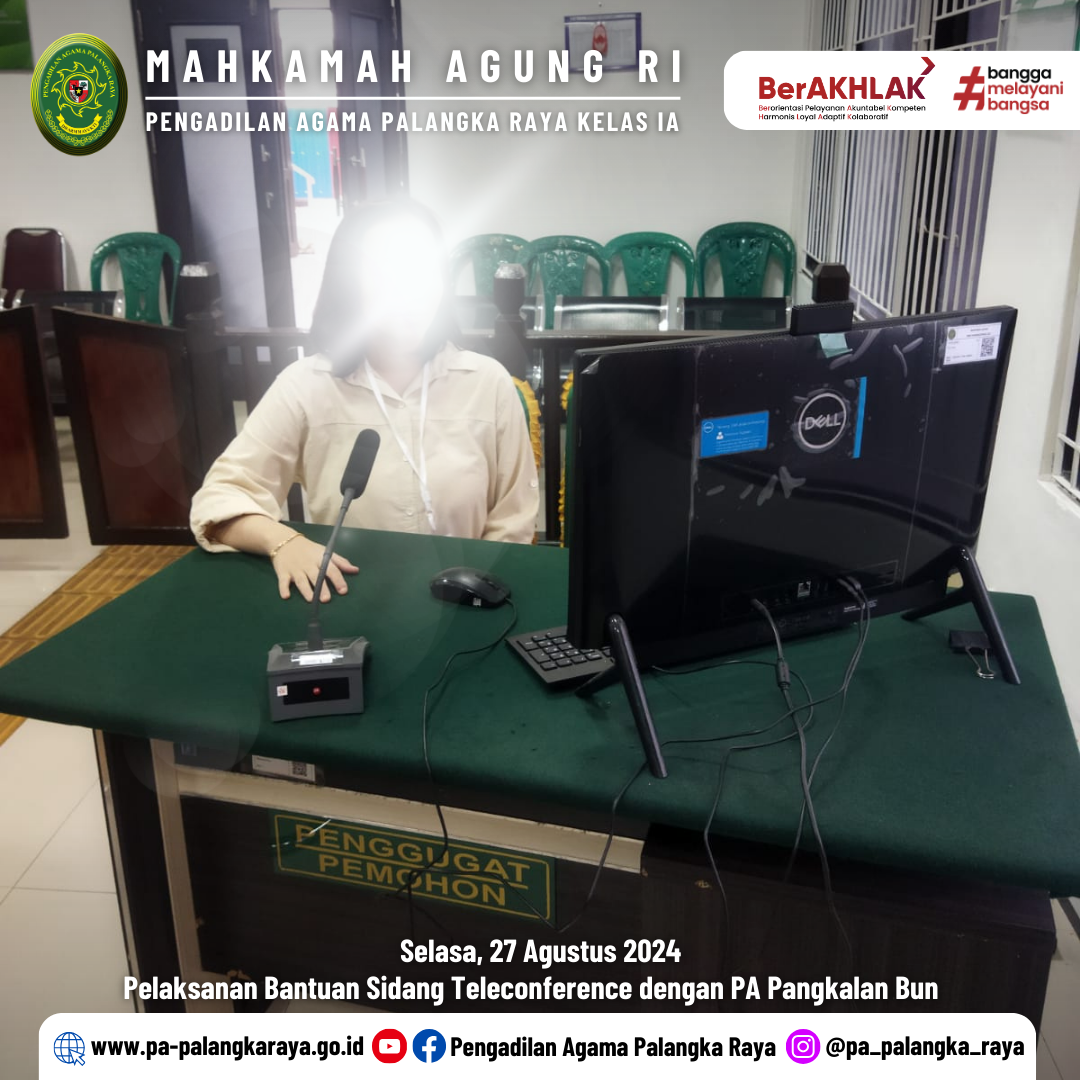 Dalam memberikan pelayanan yang prima kepada para pencari Keadilan, PA Palangka Raya melaksanakan kegiatan Sidang Teleconference antara PA Palangka Raya dengan PA Pangkalan Bun yang bertempat di Ruang Sidang I.