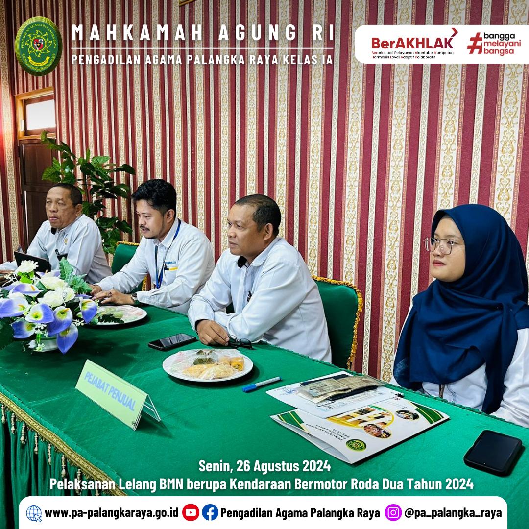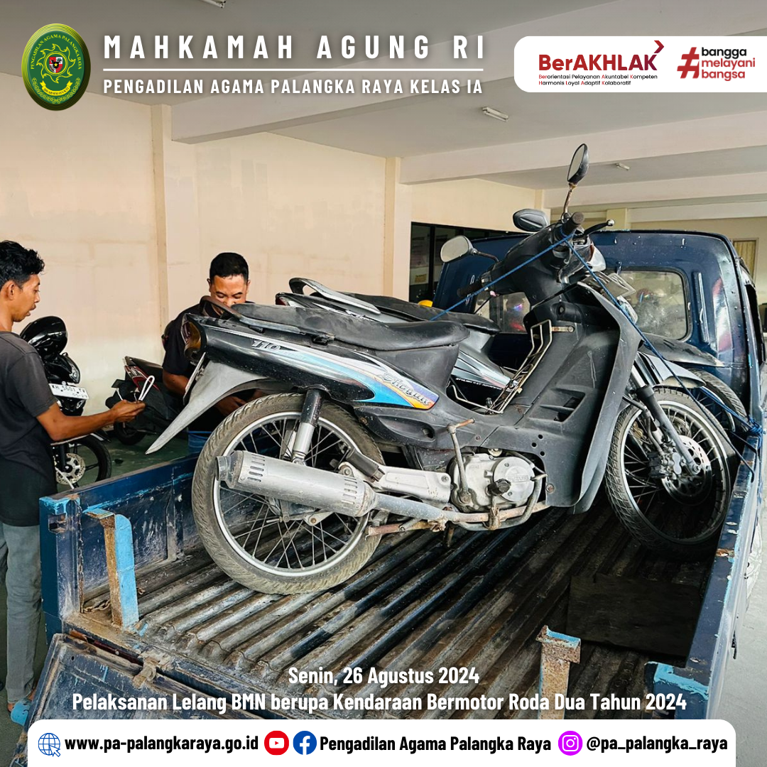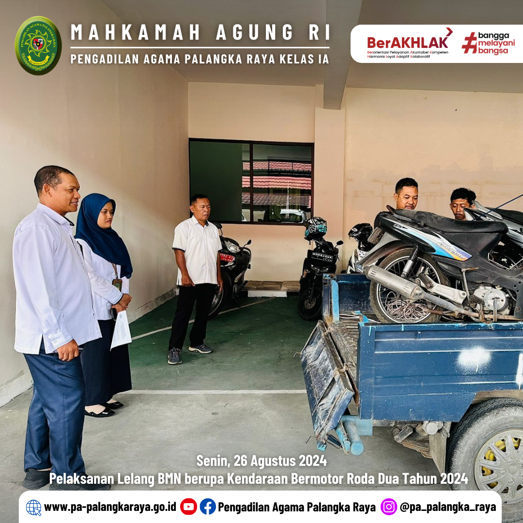 Senin, 26 Agustus 2024 bertempat di Aula Pengadilan Agama Palangka Raya dilaksanakan Lelang Barang Milik Negara (BMN) berupa 1 paket Kendaraan Bermotor Roda Dua sebanyak 2 unit motor dengan jenis motor Suzuki/Shogun FD 110 tahun 1999 dan Honda/Supra NF 125D tahun 2005. Kegiatan tersebut dihadiri oleh Pejabat Lelang dari Kantor Pelayanan Kekayaan Negara dan Lelang (KPKNL) Palangka Raya yaitu Bapak Indra Prasta Nur, S.E. dan Pejabat Penjual yaitu Bapak Misran, S.H selaku Kuasa Pengguna Barang Pengadilan Agama Palangka Raya. Kegiatan tersebut juga disaksikan oleh perwakilan kantor PA Palangka Raya yaitu Bapak Hamidi, S.H, Ahmad Fauzi, S.T dan Saputri Rizki sebagai operator BMN PA Palangka Raya.