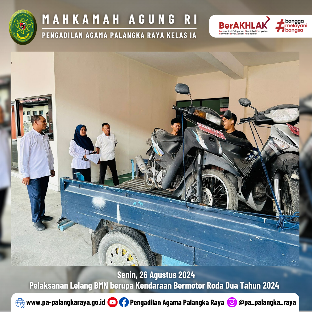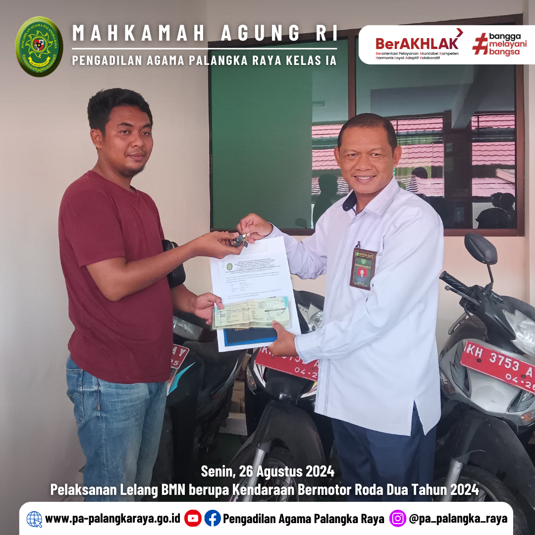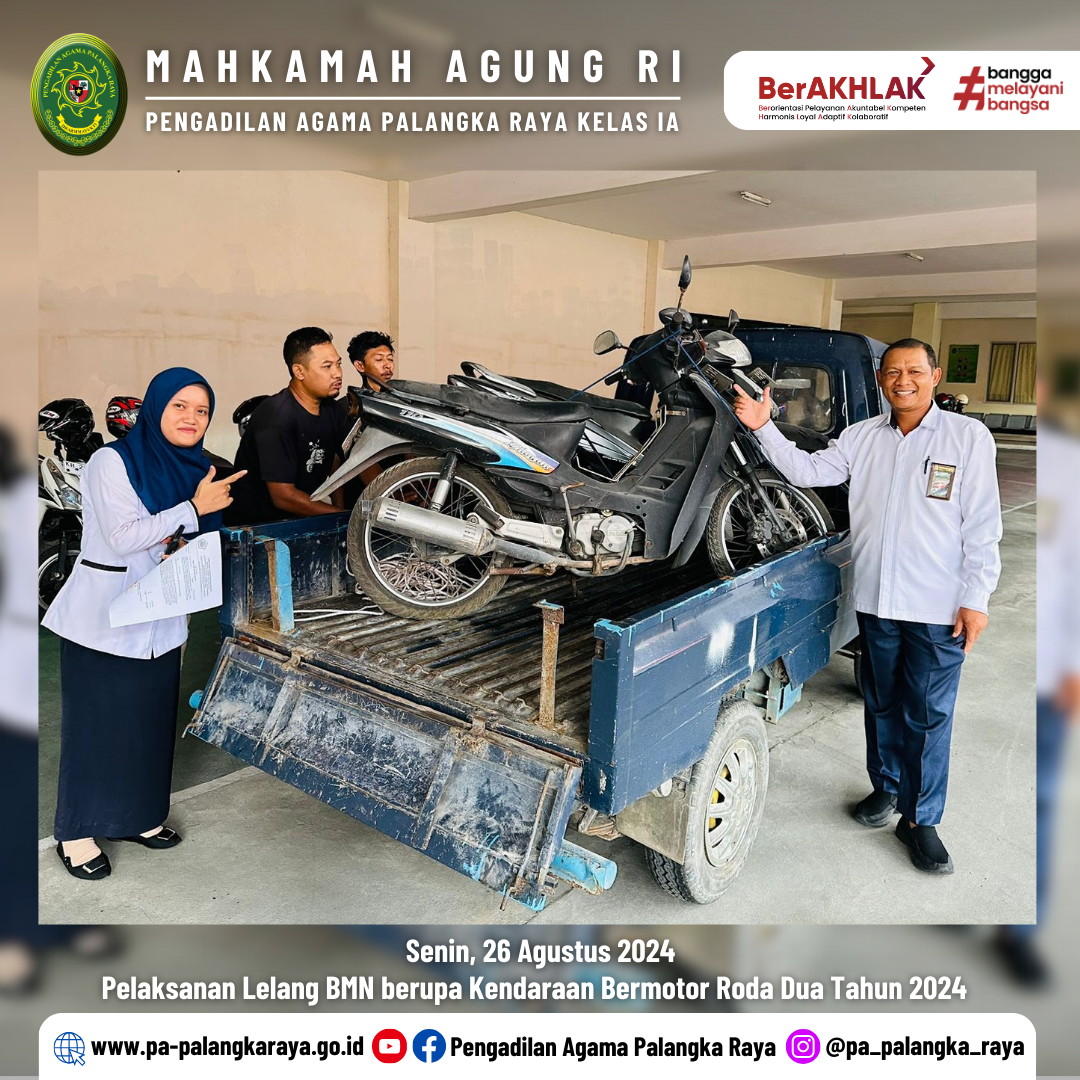 Senin, 26 Agustus 2024 bertempat di Aula Pengadilan Agama Palangka Raya dilaksanakan Lelang Barang Milik Negara (BMN) berupa 1 paket Kendaraan Bermotor Roda Dua sebanyak 2 unit motor dengan jenis motor Suzuki/Shogun FD 110 tahun 1999 dan Honda/Supra NF 125D tahun 2005. Kegiatan tersebut dihadiri oleh Pejabat Lelang dari Kantor Pelayanan Kekayaan Negara dan Lelang (KPKNL) Palangka Raya yaitu Bapak Indra Prasta Nur, S.E. dan Pejabat Penjual yaitu Bapak Misran, S.H selaku Kuasa Pengguna Barang Pengadilan Agama Palangka Raya. Kegiatan tersebut juga disaksikan oleh perwakilan kantor PA Palangka Raya yaitu Bapak Hamidi, S.H, Ahmad Fauzi, S.T dan Saputri Rizki sebagai operator BMN PA Palangka Raya.